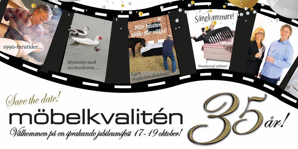 Nu är det 35 år sedan invigningen av Möbelkvalitén och det tänker vi fira STORT! Varmt välkommen på jubileumsfest fredag-söndag 17-19 oktober. Tidigare i år än vid våra andra jubileum för att du ska hinna få hem dina varor i god tid till jul. Kända möbeltillverkare kommer med nyheter och erbjudanden unika för denna helg! Vi bjuder på möbelfest med rabatter & fina erbjudanden, kaffe, glögg, godis, bullar och en riktigt mysig höststämning! Välkommen!
